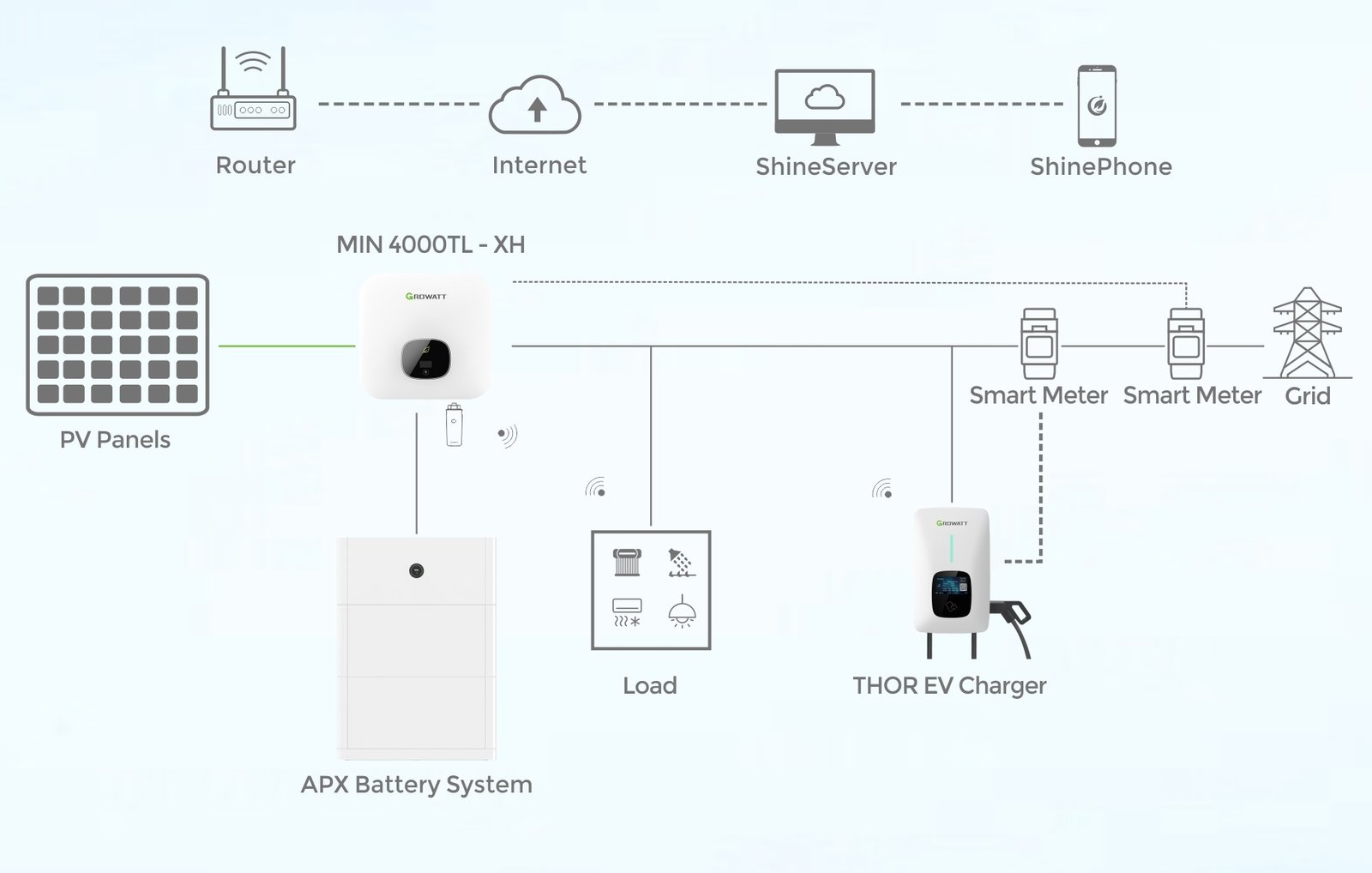 THOR EV har integreret WIFI, så du kan styre THOR EV fra Growatts ShinePhone App. Du kan fx indstille THOR EV til at lynoplade din elbil, variere lade hastighed ift. produktion på dit solcelleanlæg eller sætte et tidspunkt hvor din elbil skal være færdigopladet.