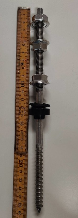 Stokskrue til tømmer med sekskantede 7 AF til montage af C-skinner, Bundplader eller skrue broer med EPDM-tætning og 18 AF Låsemøtrikker. M10 250 mm